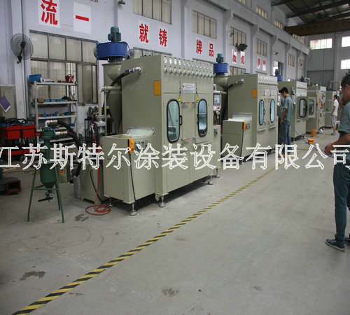 全自動玻璃水砂自動噴砂機由自動上料機、自動噴砂機和自動下料機三大部分組成:首先由自動上料機將附有兩組Tray盤Port可自動交換,需人工放Tray盤至LD Port, Tray盤定位后,移栽Arm開始取片,玻璃整列,再由移栽Arm直接將玻璃放置在載具Stg上,送入噴砂設備,當一個Tray port 取完后,會報警提醒人員裝載新的Tray盤,當空Tray盤滿杯后設備會自動報警通知人員取走空Tray盤,以此循環動作.然后到全自動玻璃水砂自動噴砂機,由人工自行調配一定的水砂比例后設備自動進行混合攪拌,自動上料機構抓取玻璃放到輸送同步帶上,進入噴砂機腔體進行噴砂,噴砂作業結束后,進入水刀處進行噴淋,噴淋結束后由風刀進行吹干。吹干后移動至下料機移栽位置,由移栽將玻璃抓取至下料機FORK上,以此循環。噴砂、清洗、吹干區域有擋邊防止工件位移。最后自動下料機將附有兩組CST Port可自動交換,需人工放空的CST至UnLD Port, CST翻轉90°后,氣缸機械定位,由移栽arm從治具上取玻璃放置Fork上,送入CST, CST Port內的基板利用Fork方式由最高層開始放片,Fork 真空感知Sensor/玻璃光纖sensor OFF后,Fork自動退回到等待位置,以此循環。當CST裝滿后,設備會報警提示人員將CST取走并裝入空的CST。