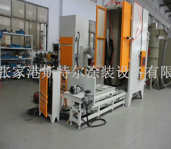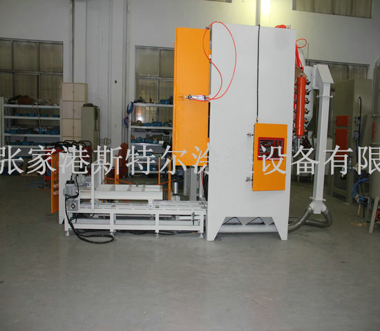 本套設備主要由主機、輸送小車、噴砂系統、回砂系統、除塵系統、裝卸升降平臺、電氣控制系統、空氣壓縮機(用戶自備)等組成。