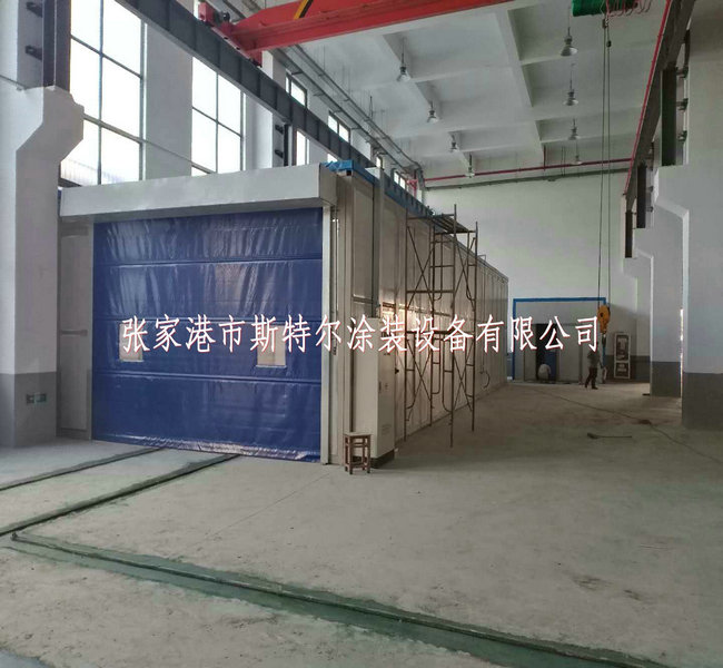 三套涂裝房包括噴砂房,噴漆房,噴鋅房并排置于車間內北側,三套大門平齊朝南,北側與車間之間留有2米距離,用于制作過濾箱和檢修通道。三套房體之間公用兩扇墻體。